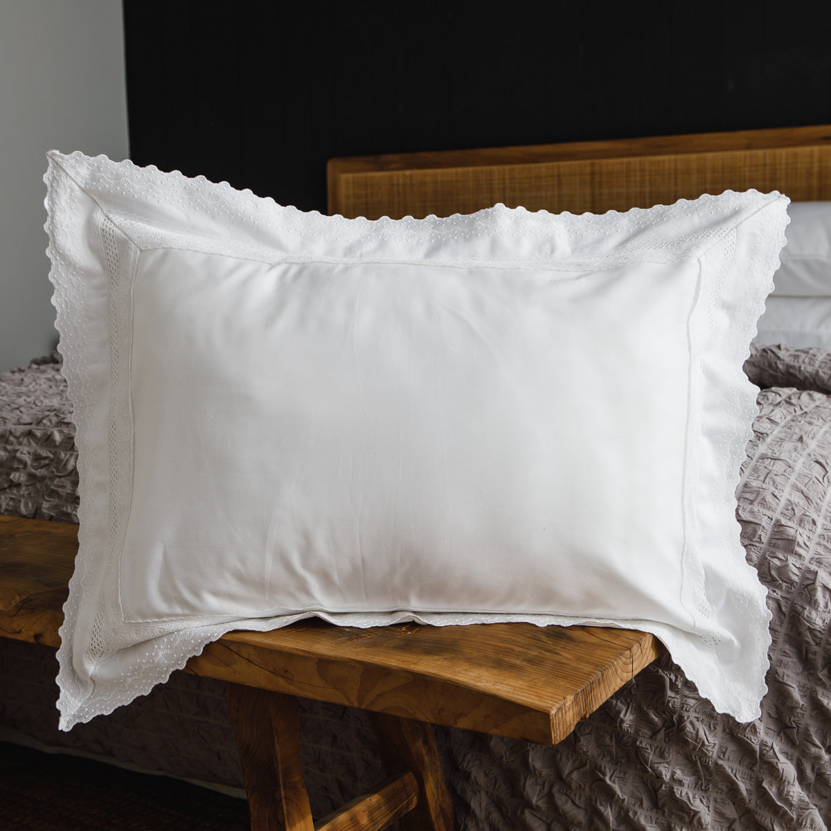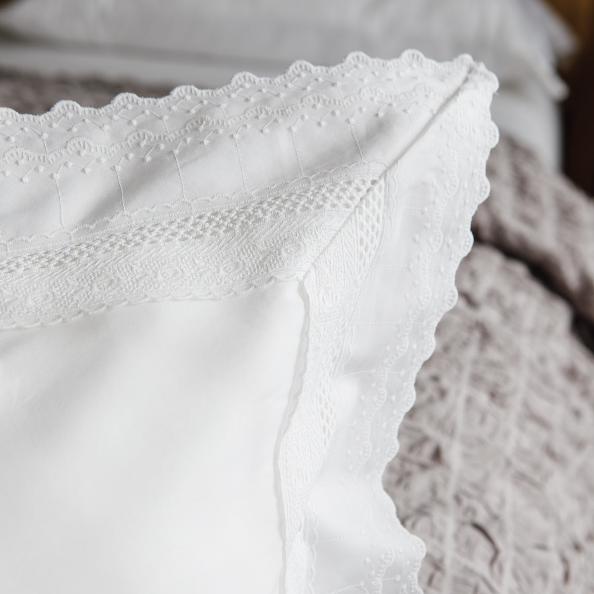 Este set de fundas para sham está confeccionado en algodón egipcio de 400 hilos y presenta un delicado detalle de broderie que realza la presentación de la cama con un toque clásico y sofisticado.