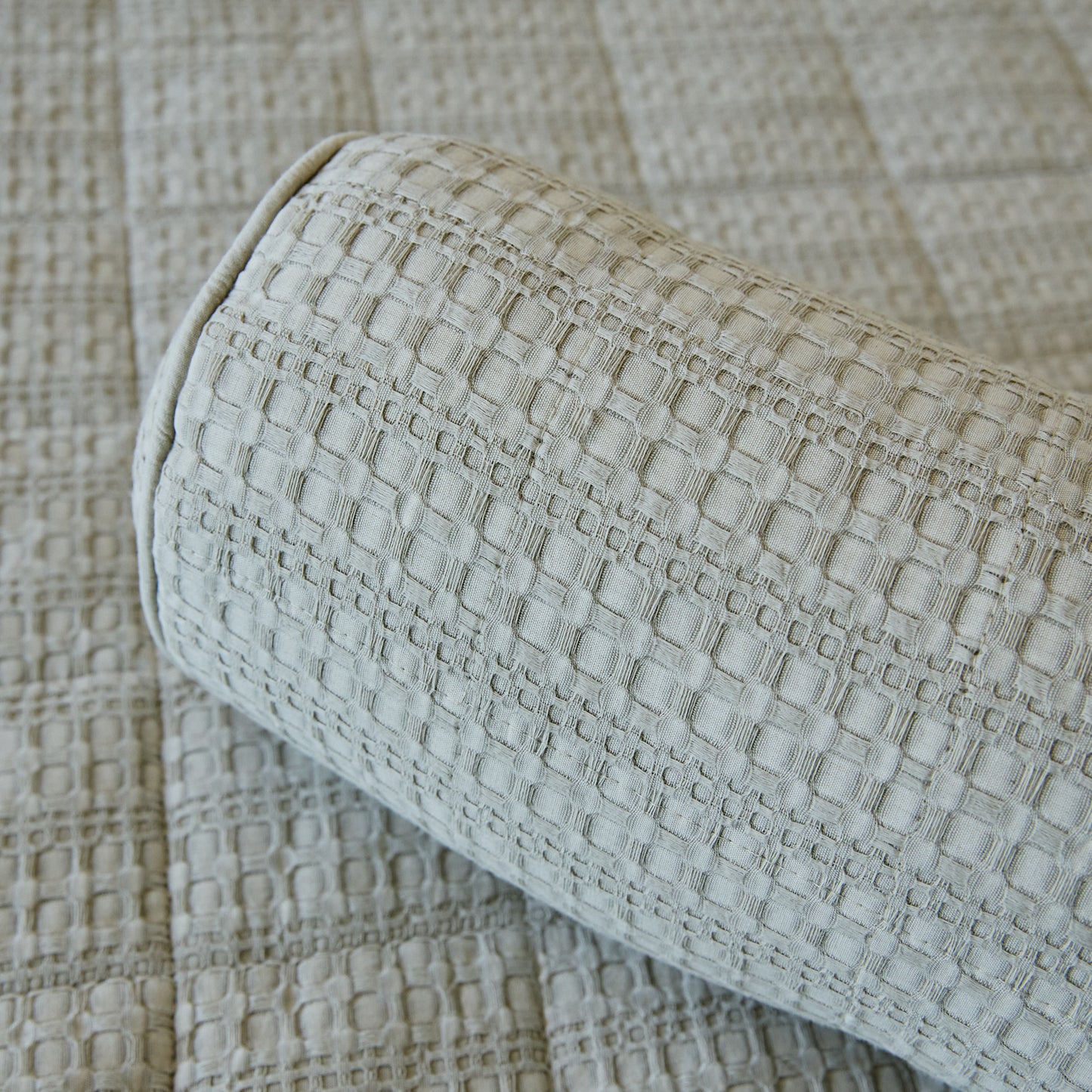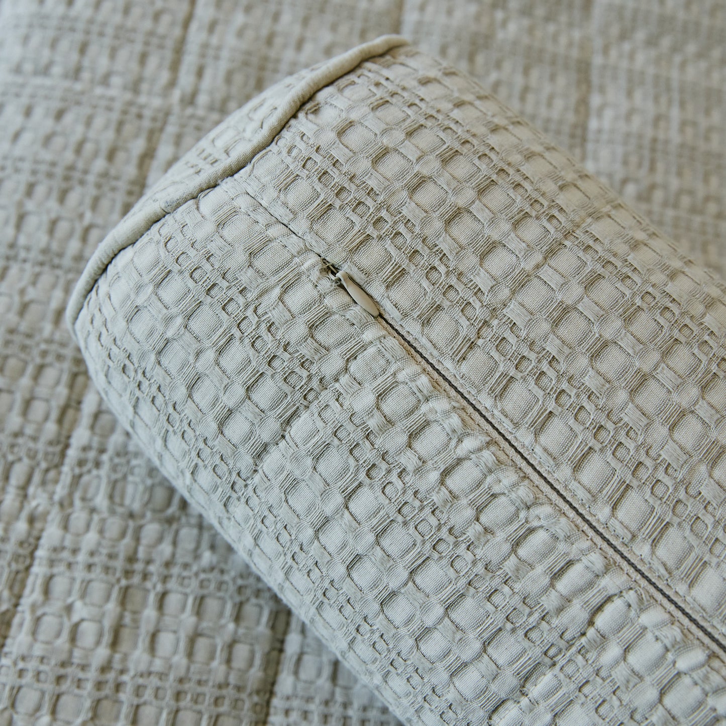 Almohadón tipo caramelo confeccionado en tela 100% algodón. Aporta textura y un toque decorativo perfecto para complementar el cubrecama Bradford. Liviano, suave y versátil, ideal para sumar calidez al dormitorio.