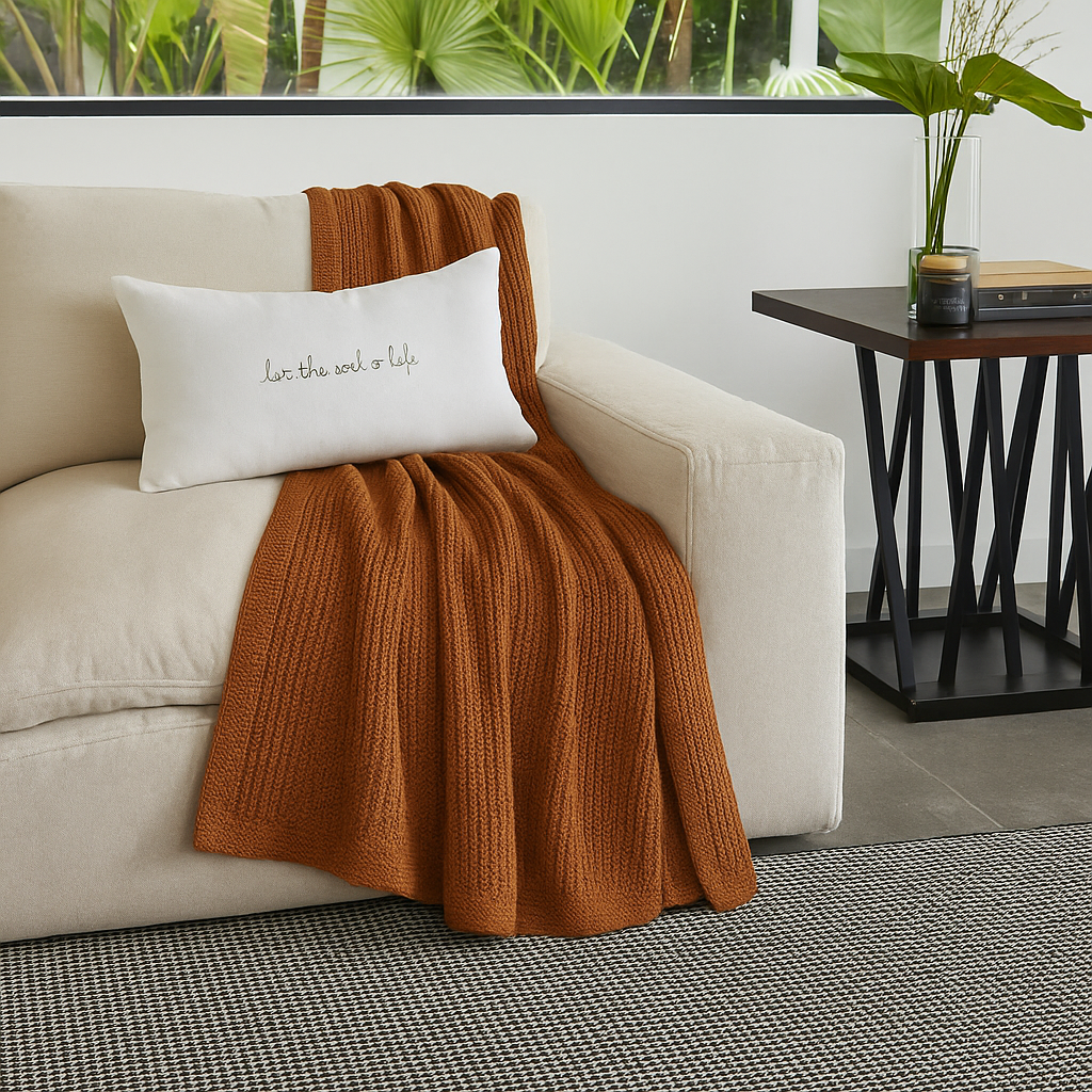 Manta tejida en 100% algodón, suave al tacto y con un acabado natural que aporta calidez y estilo a tus espacios. Ideal para usar como pie de cama o como complemento decorativo en el living.