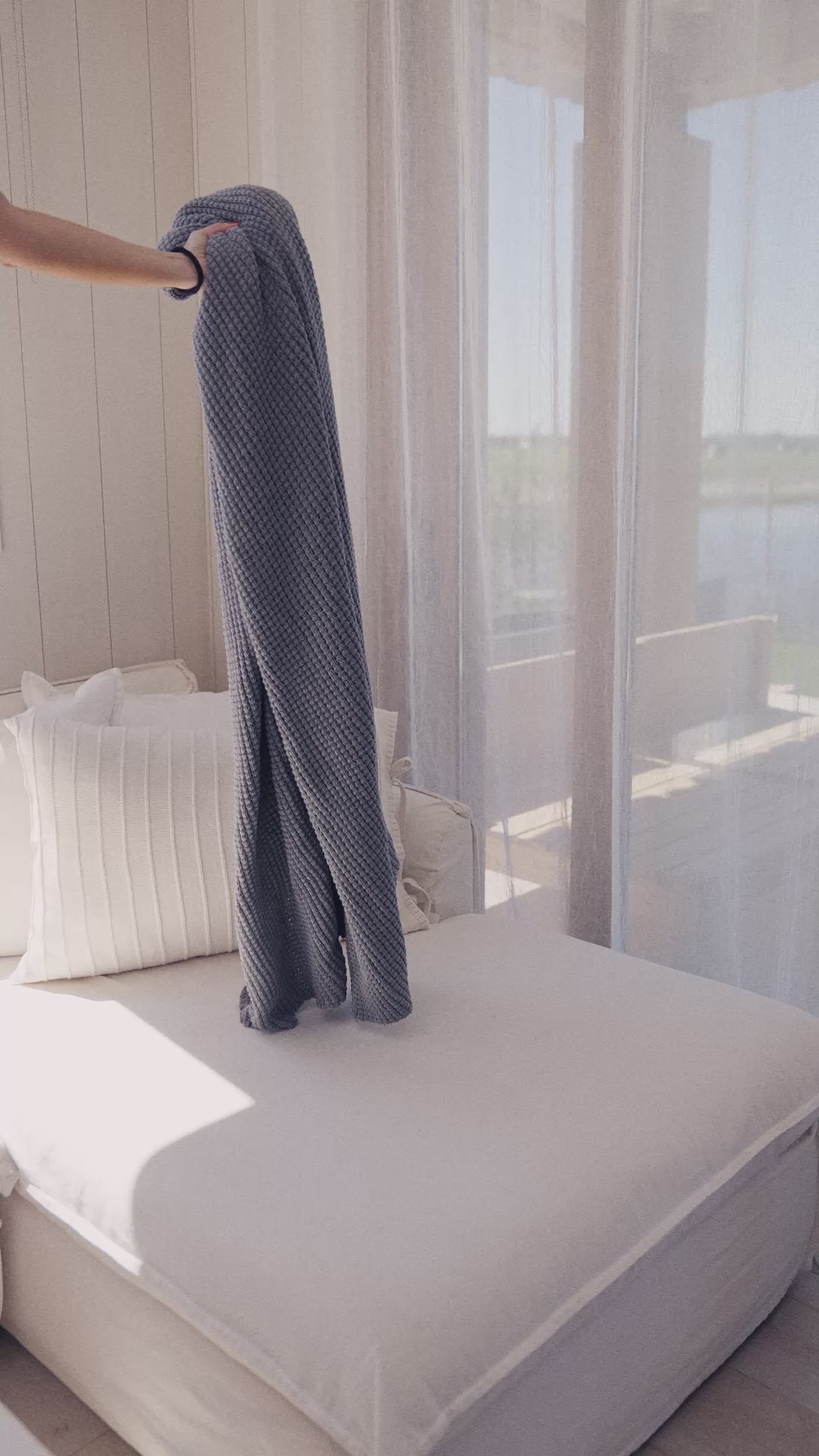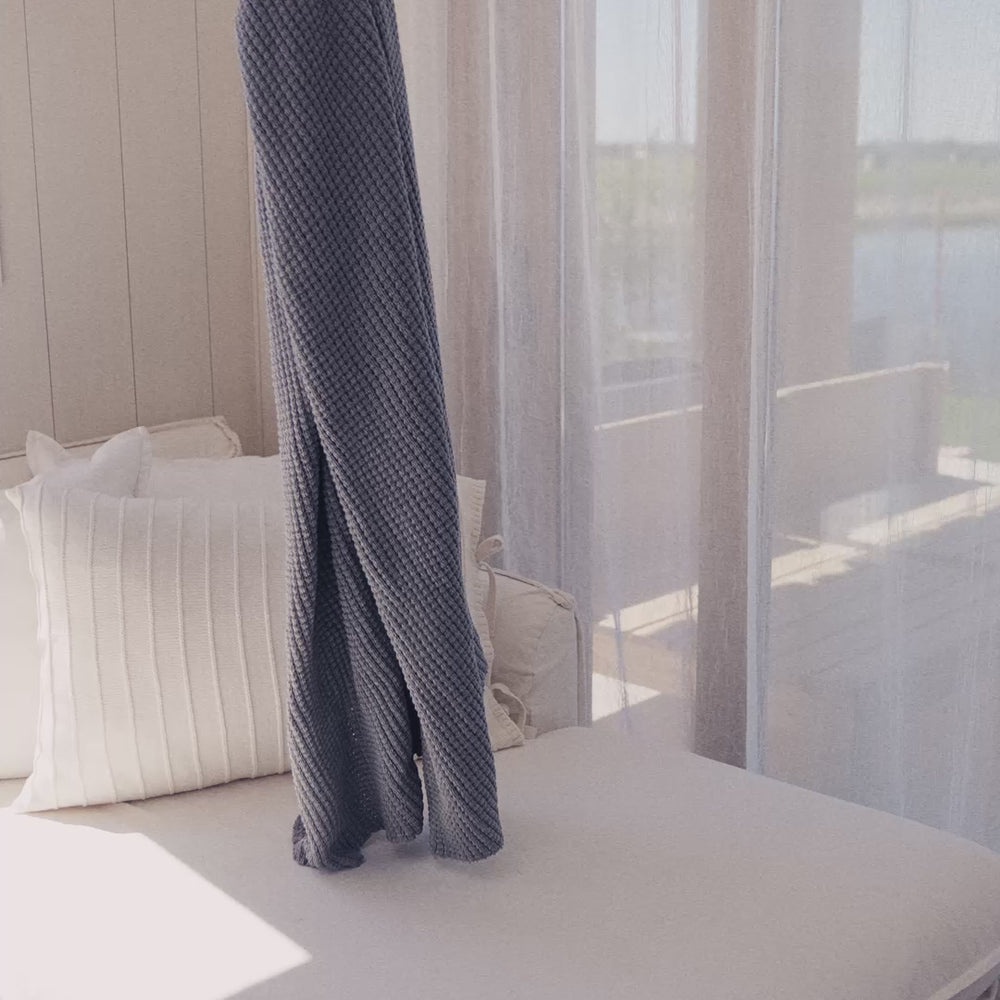 Manta tejida en 100% algodón, suave al tacto y con una textura que aporta personalidad y calidez a cualquier ambiente. Su diseño la convierte en un complemento perfecto para pie de cama, sillones o rincones de relax.