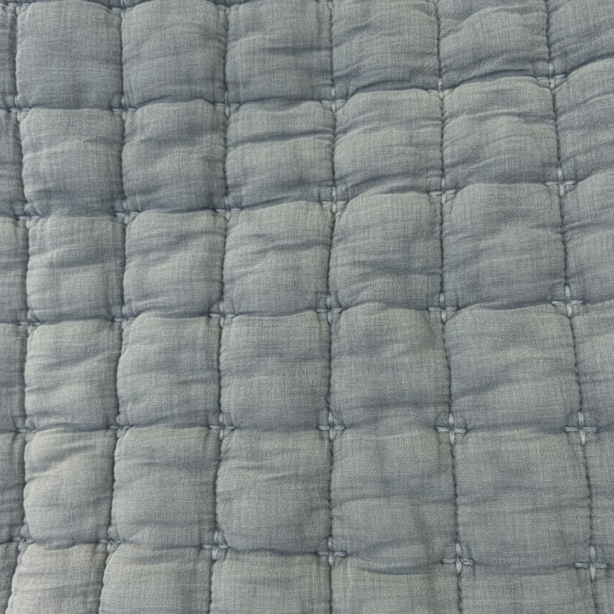 De un lado, presenta un delicado tramado floral con relieve, de inspiración artesanal, que aporta profundidad y riqueza visual. Del otro, un matelassé de cuadros irregulares con textura levemente arrugada que transmite calidez y un estilo más relajado y contemporáneo.