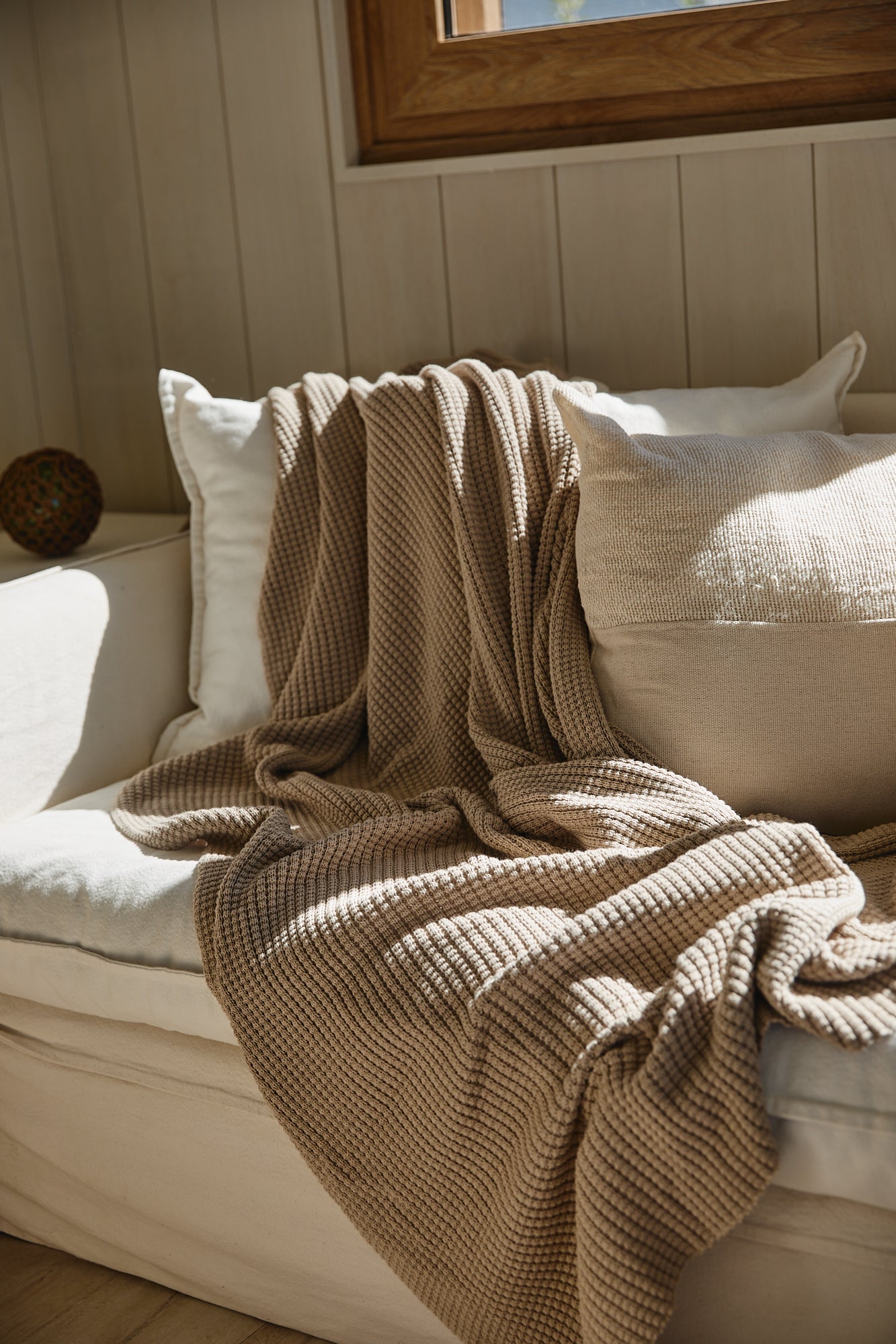 Manta tejida en 100% algodón, suave al tacto y con una textura que aporta personalidad y calidez a cualquier ambiente. Su diseño la convierte en un complemento perfecto para pie de cama, sillones o rincones de relax.