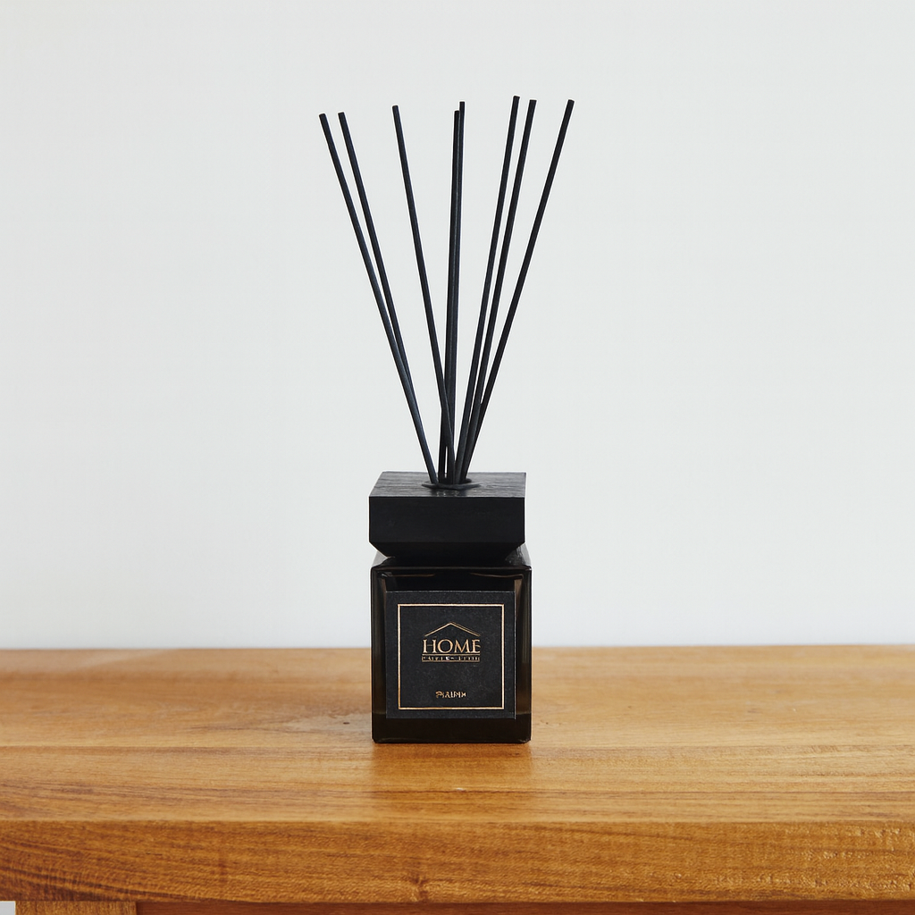 Un elegante difusor en envase de vidrio negro con varillas de fibra que aromatiza de forma constante y natural.